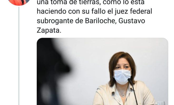 La Gobernadora, Arabela Carreras, rechazó la decisión del juez federal subrogante de Bariloche, Gustavo Zapata, de no reconocer un delito en la ocupación de predios en El Bolsón. «Es inadmisible que un magistrado avale una toma de tierras», dijo la Mandataria.